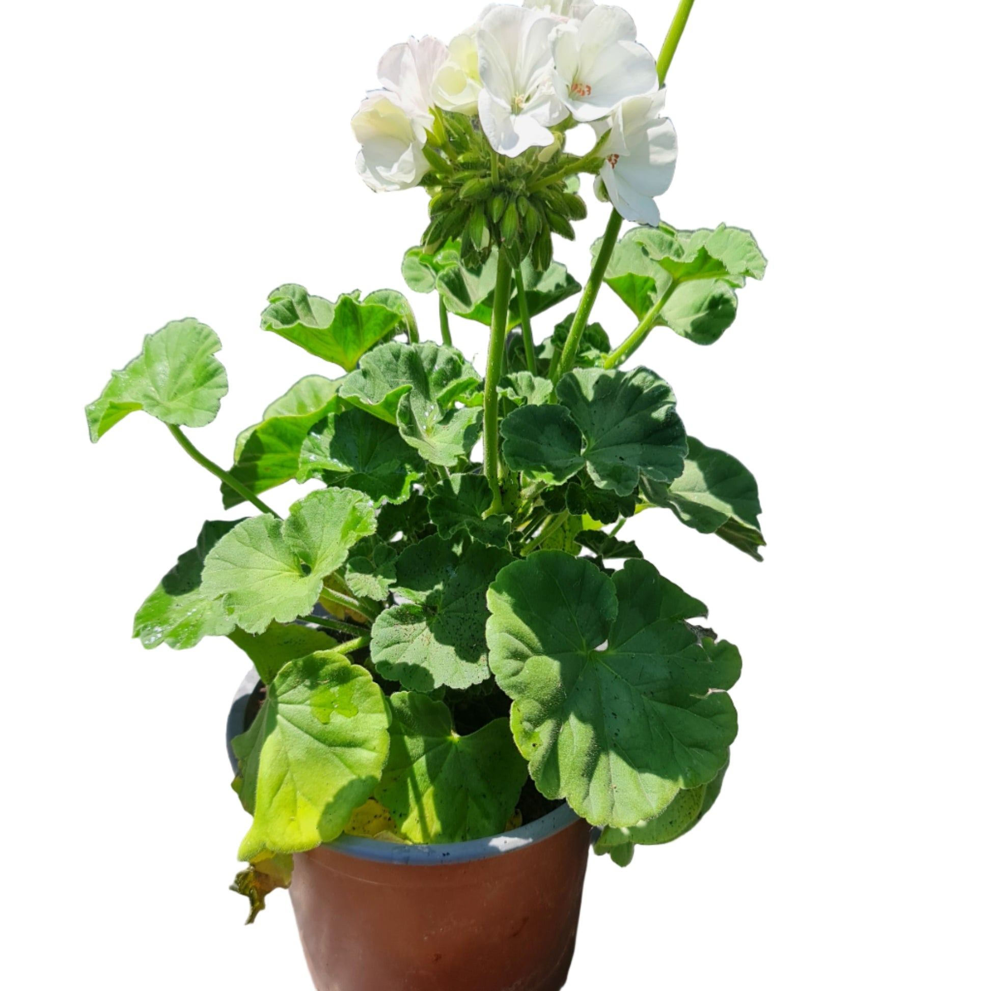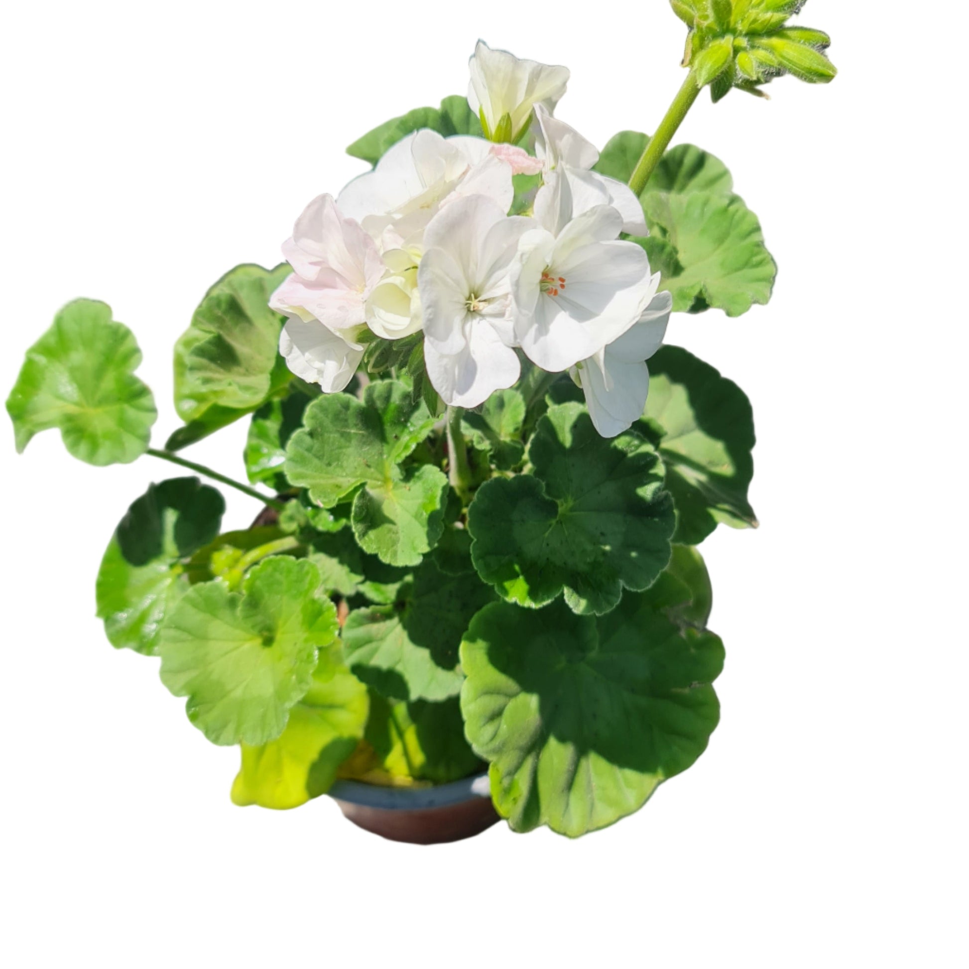 Hojas: Son redondeadas (reniformes), de color verde claro a oscuro. Una característica distintiva de los zonales es que a menudo presentan una banda o zona oscura (marrón o granate) en forma de herradura en el centro de la hoja.