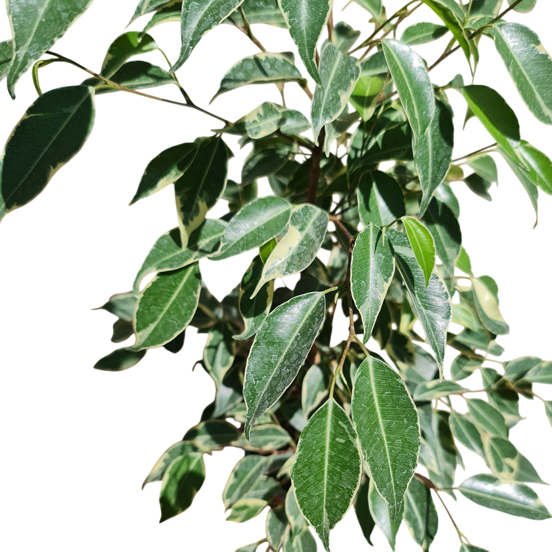 Es una planta ornamental de la variedad Ficus benjamina, con hojas verdes y variegaciones de color crema. Es una planta versátil que se puede usar tanto en interiores como en exteriores.
