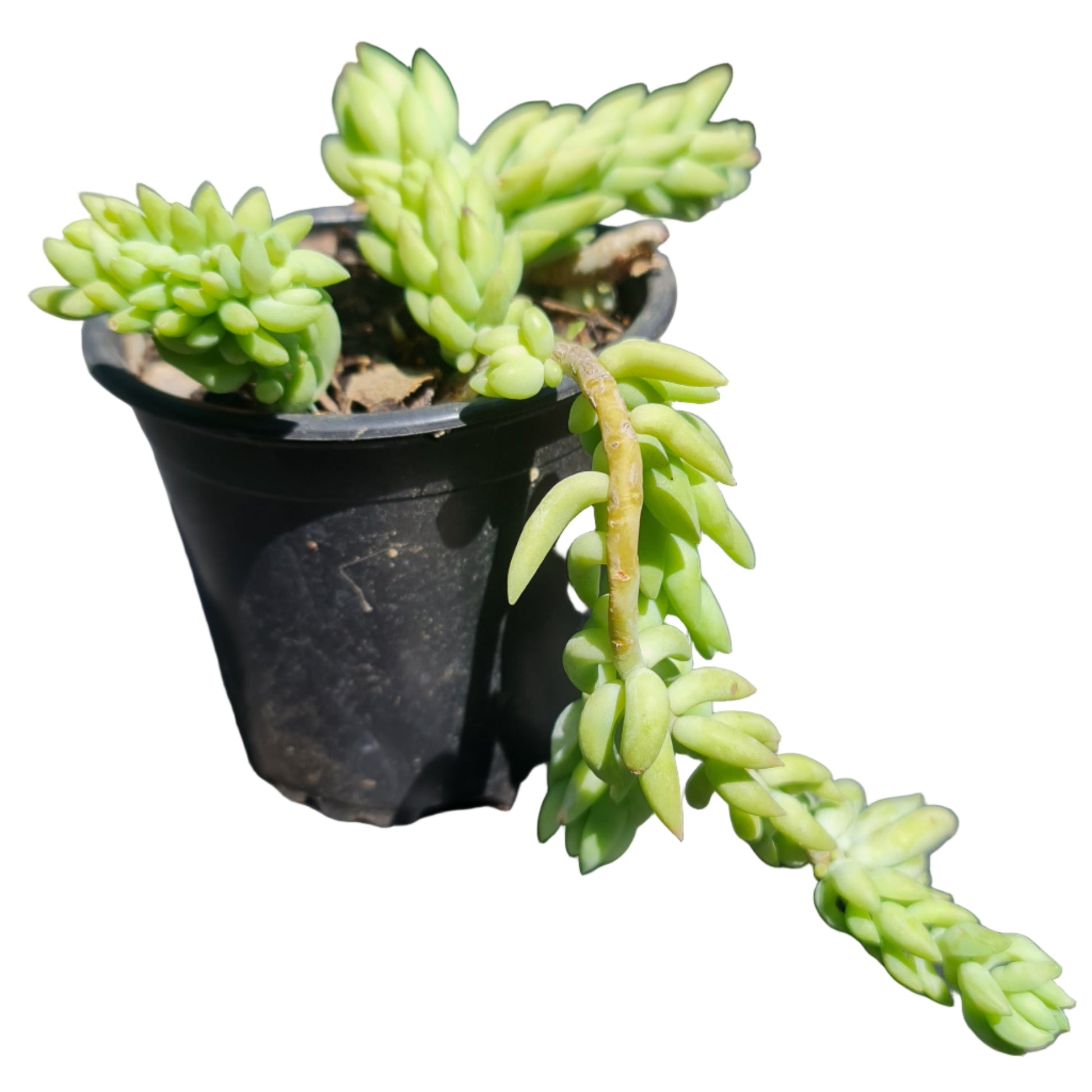 El Sedum morganianum, comúnmente llamado "cola de burro", es una suculenta colgante con tallos largos y carnosos cubiertos de hojas regordetas de color verde azulado. Sus hojas son cilíndricas y se desprenden con facilidad. En verano, produce pequeñas flores en forma de estrella de color rosa o rojo en las puntas de los tallos.
